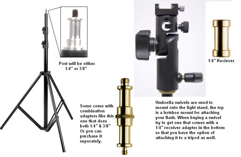 Now that you have a flash or flashes and can trigger them remotely you'll need to put them on something. Investing in at least one proper light stand is recommended but cheap tripods can fill in as well depending on your needs. If you're wanting to special softboxes etc a light stand is the way to go but if you just want to mount the flash or even add an umbrella or two a tripod will suffice. Places like XS cargo or the various liquidation centers often have tripods for around $20. With that said you can find cheap ones at www.bhphotovideo.com starting at $20 USD + S&H as well. Cheap swivels can be found for ~$10 each online, “normal” ones are about $30 each. Post adapters like the 1/4” receiver can actually be pretty pricey so just try to buy a swivel that comes with one ;)